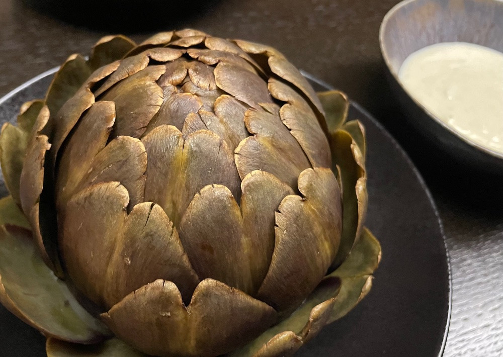 Bei uns gab es heute eine wunderbare violette Artischocke, die aber nach dem Kochen nur noch grün war. Dazu einen Dipp aus Jogurt, hartgekochtem Ei, Harissa, Senf, Zitronensaft und Knoblauch.