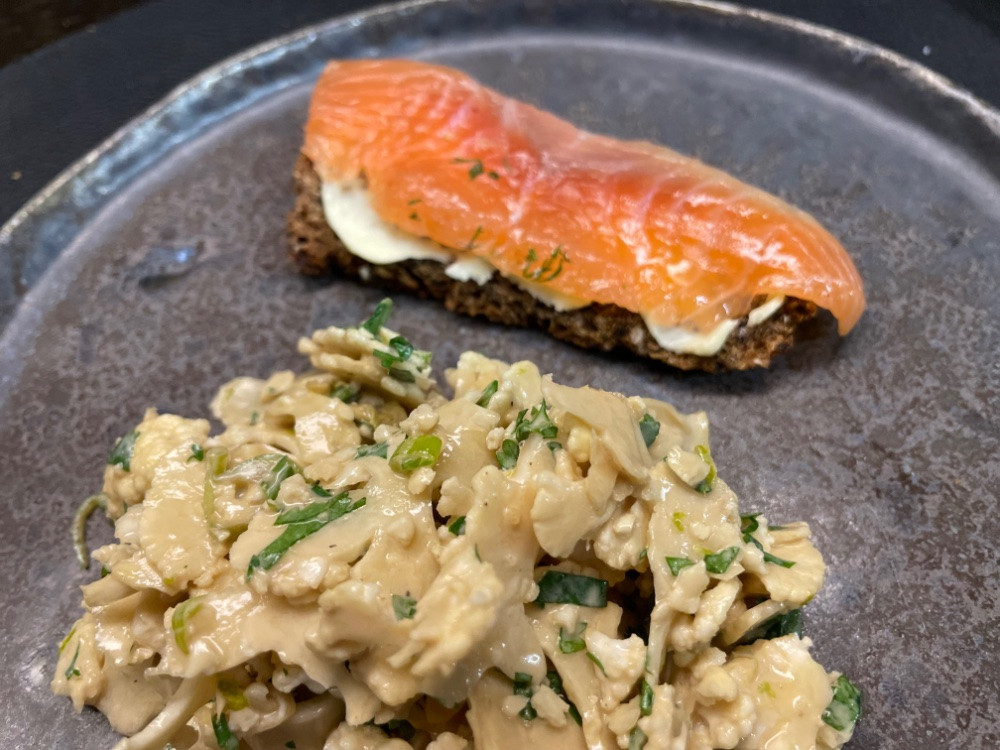 Bei uns gab es rohen Blumenkohlsalat und Lachsbrote dazu. Nach meinem Testbeizen vom Lachs neulich habe ich direkt mal eine ganze Seite gebeizt.