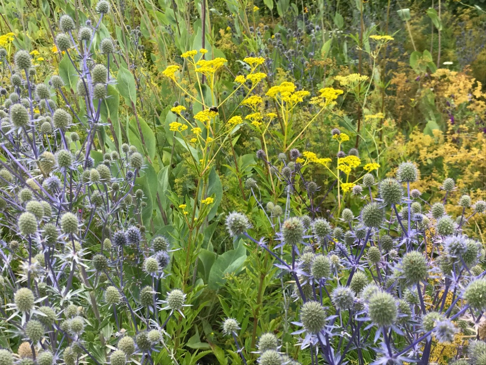 Eryngium ist immer schön. Und Patrinia, Rudbeckia maxima