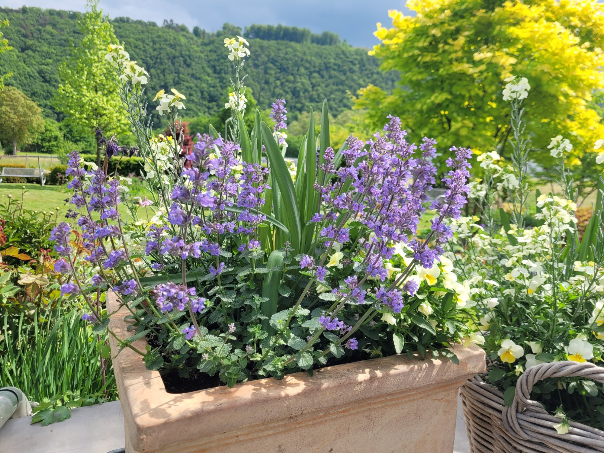 Im zweiten Jahr habe ich diese besonders kurze, reich blühende Nepeta im Topf.
