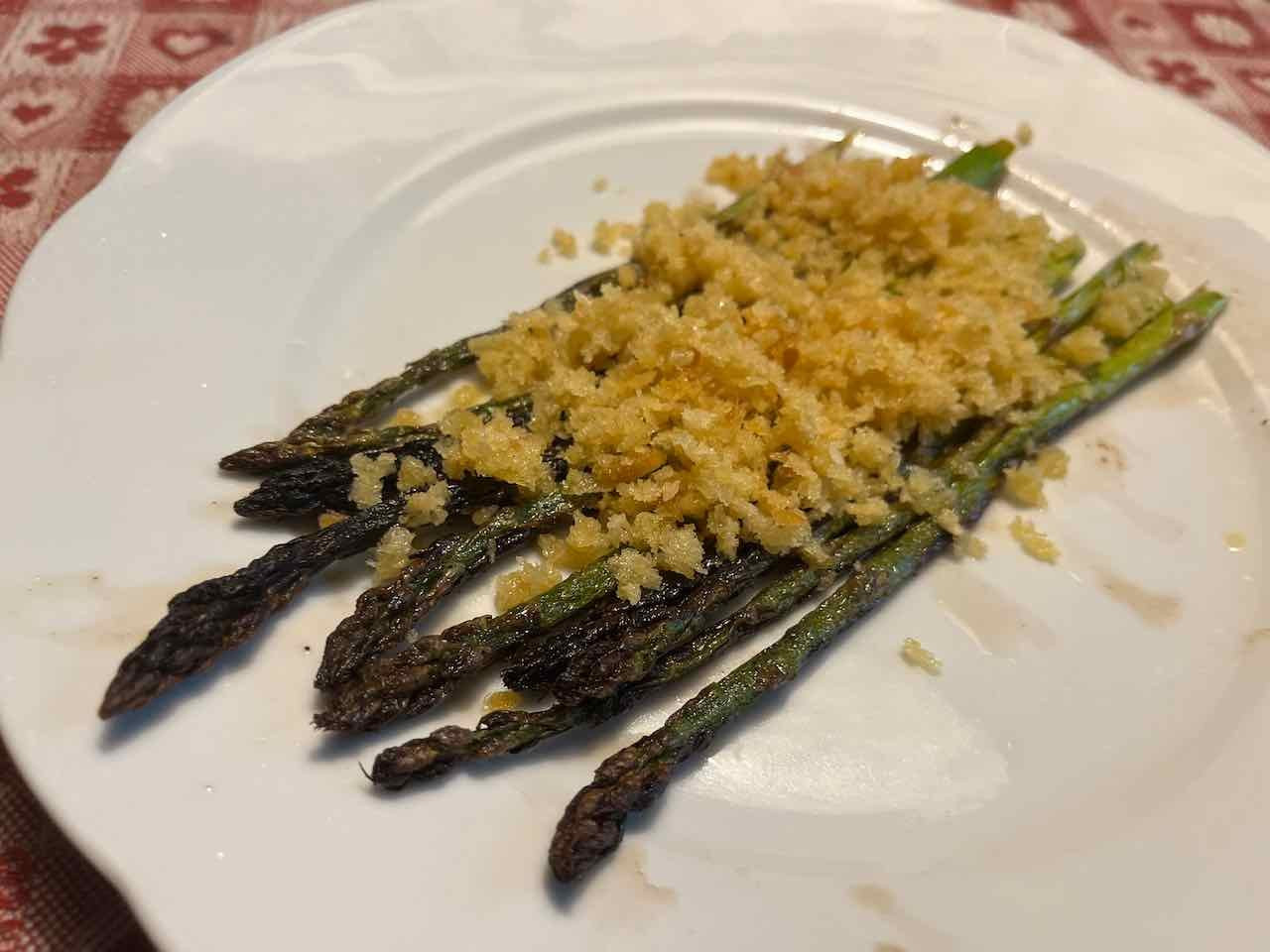 Hauptgericht grüner Spargel mit Butter, Öl und Zitronensaft gebraten, mit Weißwein abgelöscht und mit Butterbröseln serviert zum Vermentino/Viognier 2019 "Caractère d'Agly" aus Südfrankreich