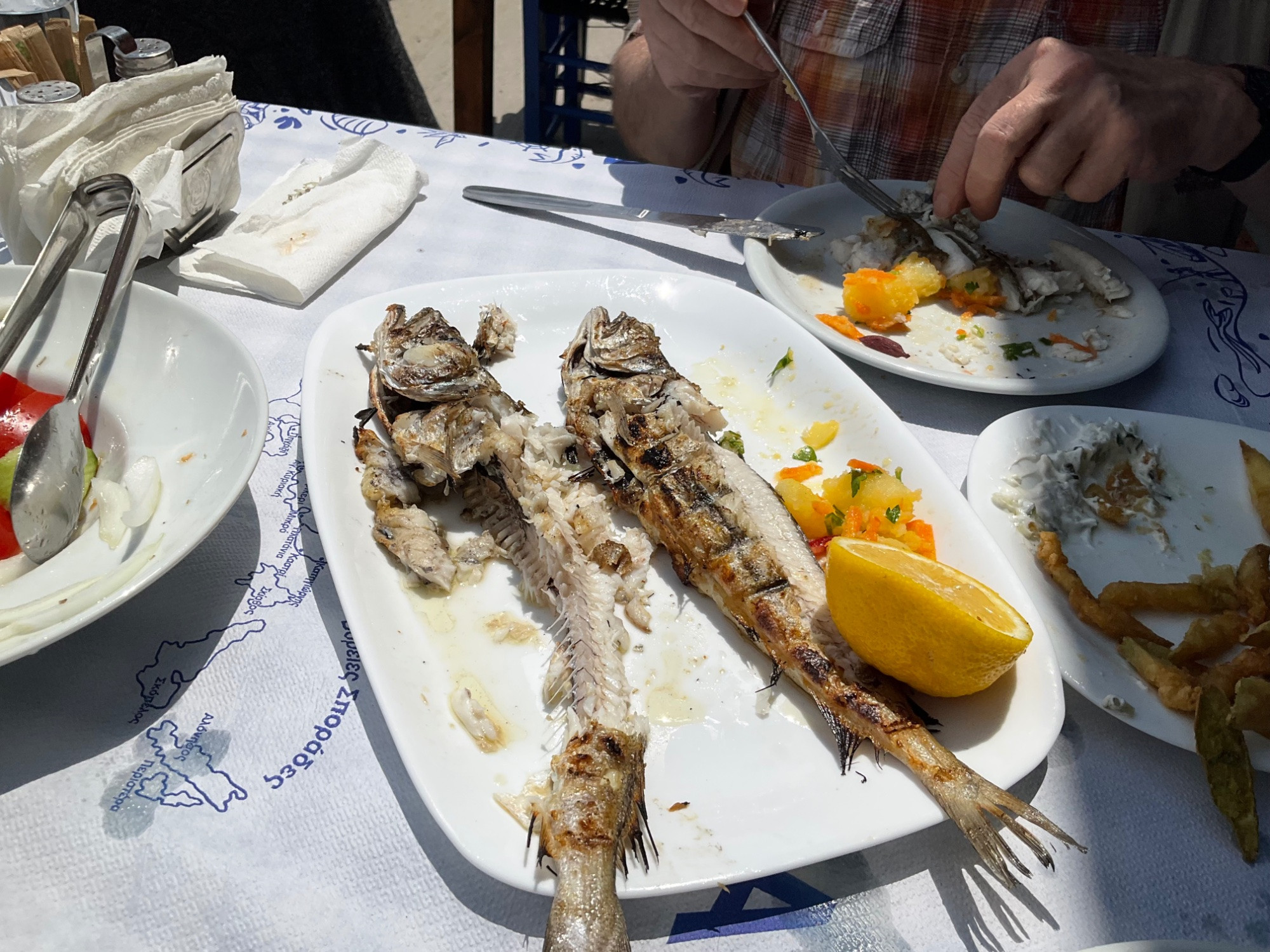 Ein Höhepunkt waren diese beiden Fische (sorry, ich habe nicht gleich ans Fotografieren gedacht), Red Mullet, dazu gab es etwas Kartoffelsalat. Wir hatten uns noch einen Bauernsalat und frittierte Zucchini dazu bestellt. Der Kartoffelsalat war mit Essig- Öl-Dressing, Möhren, Petersilie.