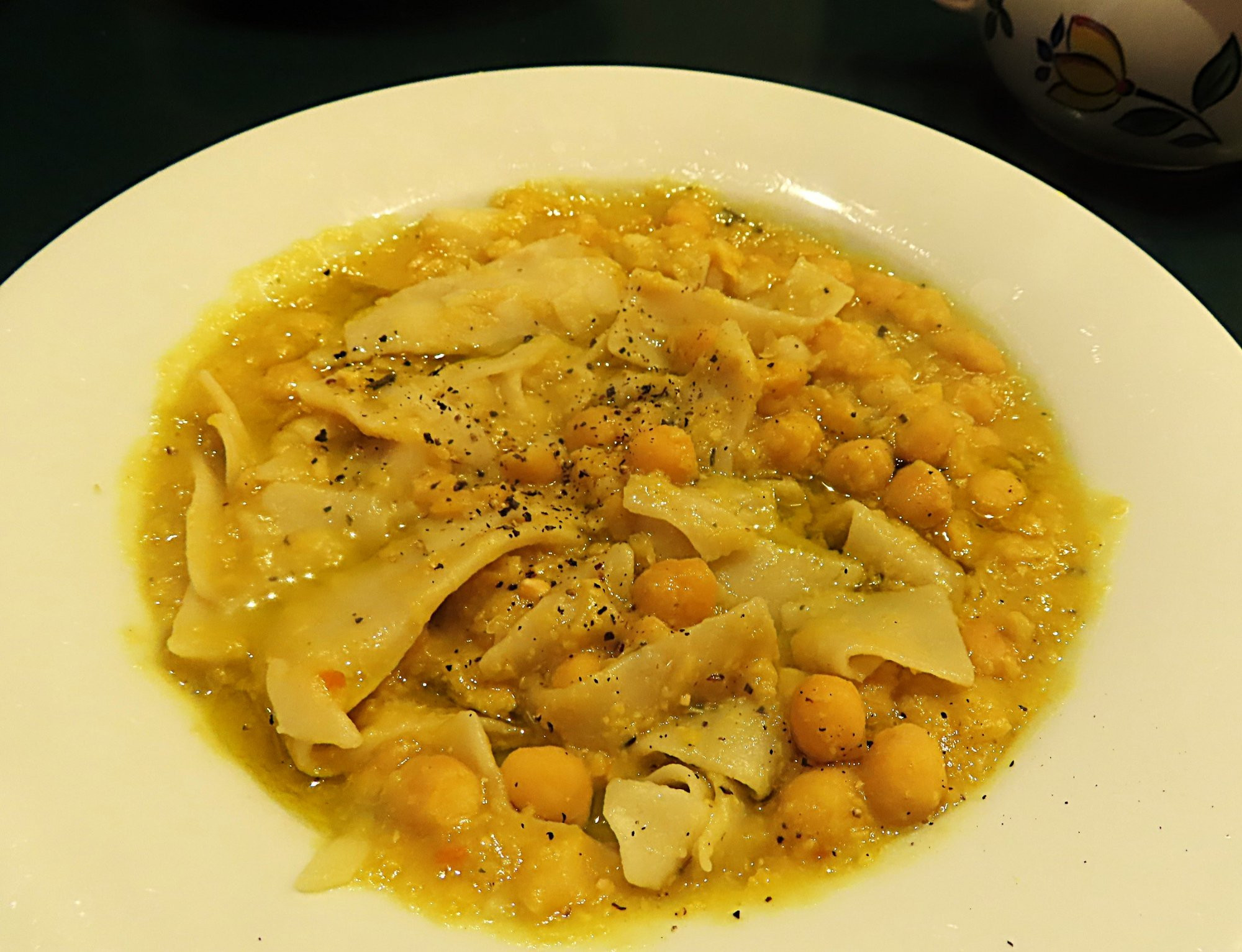 Hier ist es nach wie vor eher einfach: Gestern Rehragout in passierter Wurzelsauce, Waldviertler Knödl und Preiselbeeren, heute Stracci e Ceci, vorher/dazu/danach insalata mista aus Radiccio, Rucola und Fenchel.