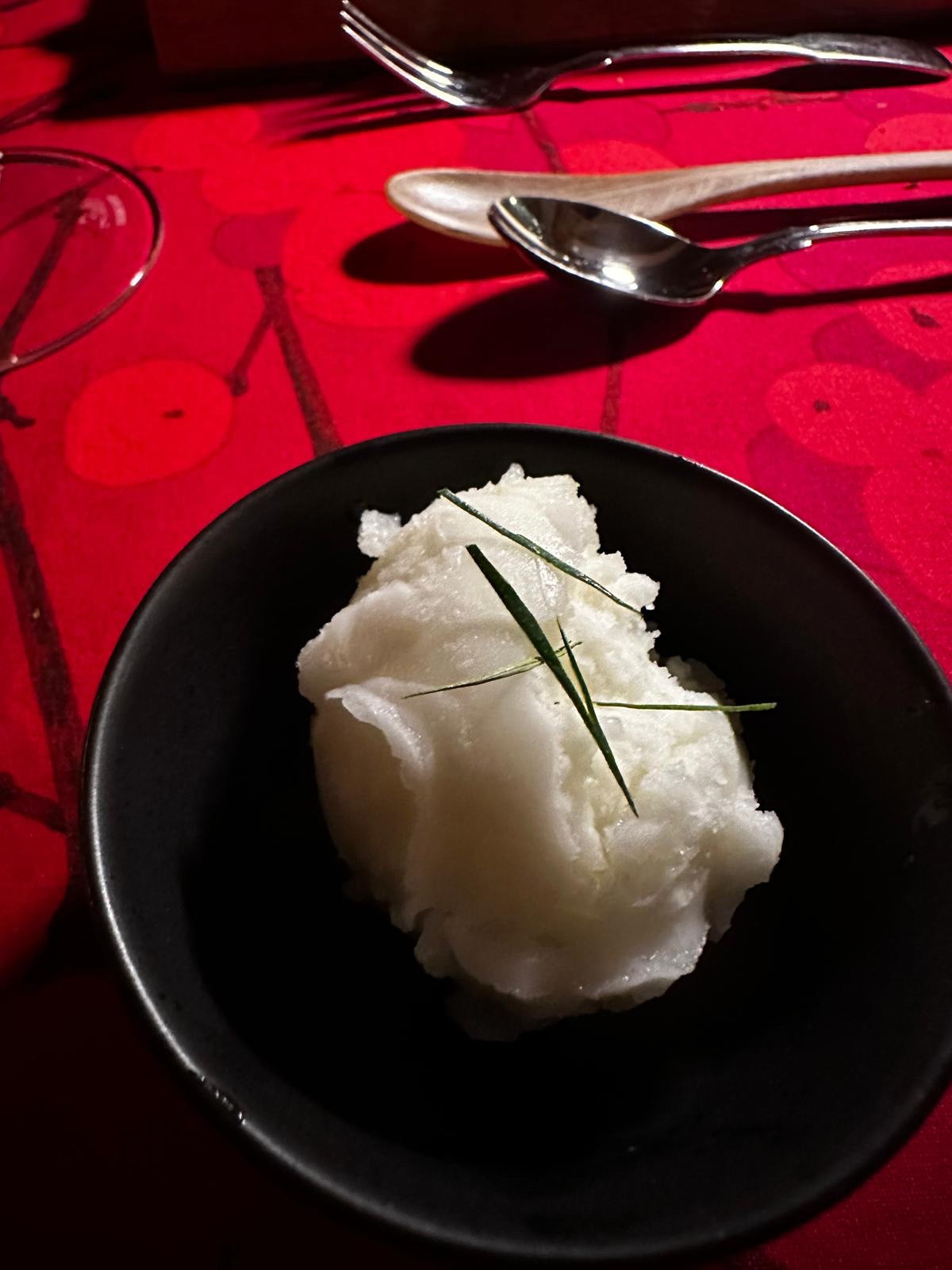 Danach Kafirlimettensorbet, Kabeljau mit Beurre Blanc, Süßkartoffelstampf (das nächste mal wieder mit Fregola Sarda) und Granny Smith-Limetten-Chili-Kugeln. Die Kapuzinerkresseblattdeko fehlt.