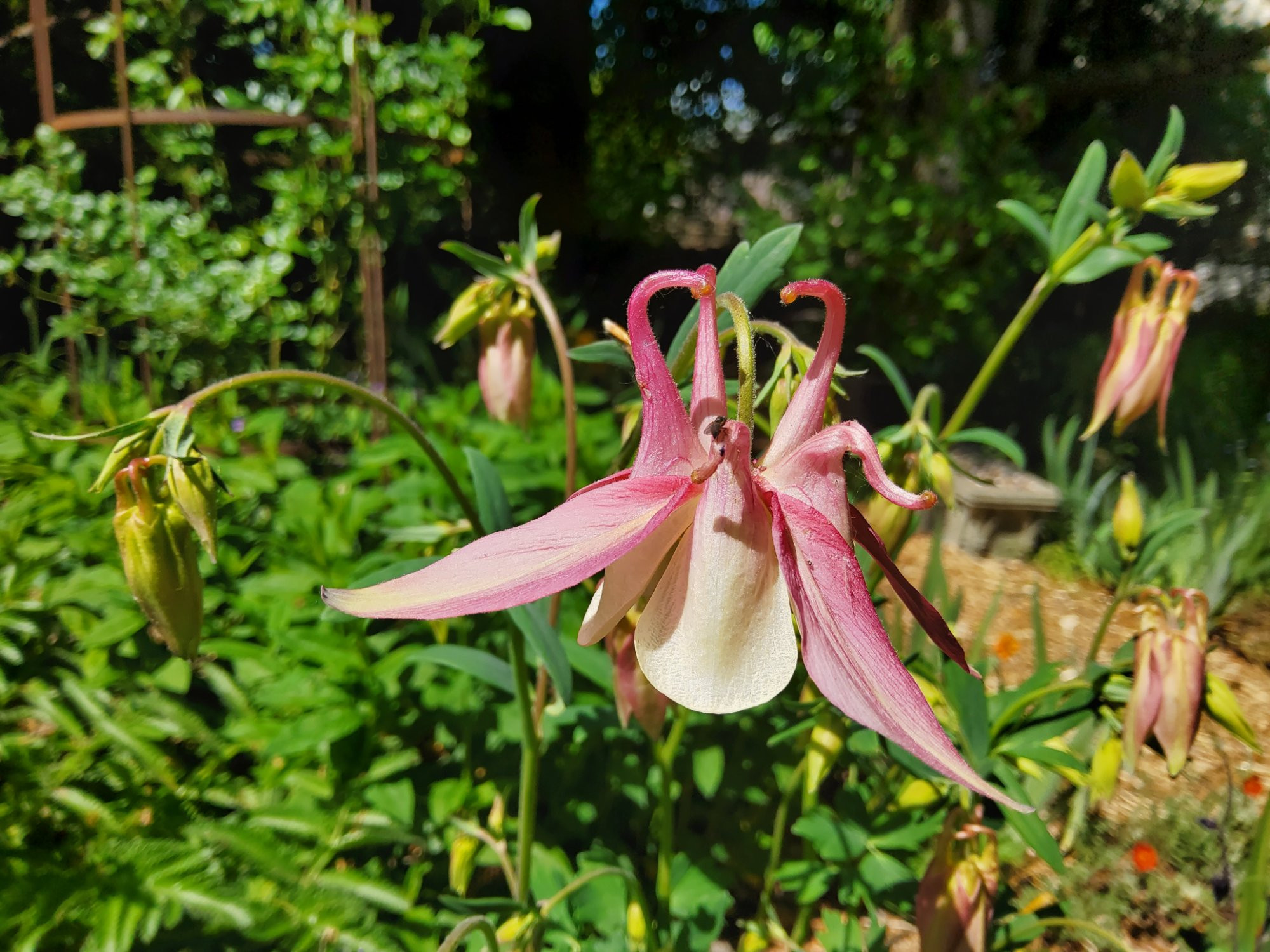 Einige Aquilegia-Hybriden in Rosa, Lila und Weinrot erhalten sich hier durch Aussaat gut. Gelbe sind weg. Nun werden die Roten probiert.