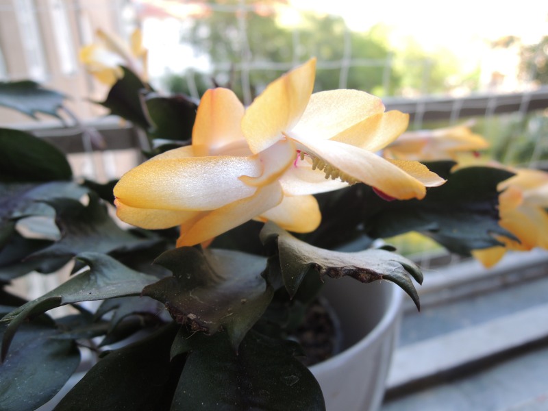Meine gelbe Schlumbi blüht auch gerade. Sie steht im Freien und ist - anscheinend wegen der Hitze - fast weiß.