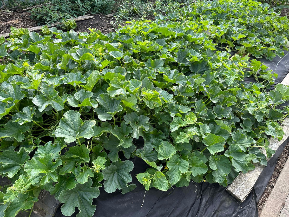 Obwohl auch empfindliche Sorten drin sind, hier liegen fünf unreife Charentaismelonen: