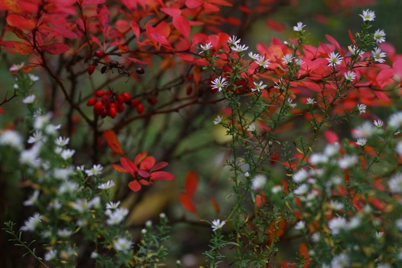 Ich wollte heute eigentlich nur ein Foto von der Berberitze machen, deren Rotfärbung gerade ihren Höhepunkt erreicht. Die Blätter werden jetzt wohl bald fallen.Ich mag diese Pflanze sehr, die ja sonst meist nur uninspiriert als Begrenzung städtischer Vorgärten eingestetzt wird (zumindest in Berlin nehme ich das so wahr).Jedenfalls fiel dann mein Blick auf die kürzlich gekauften und noch nicht ausgepflanzten Astern.Vielen Dank übrigens an alle Schreiber dieses Threads, er hat mich dazu verführt, mir auch mit ein kleines Sortiment der etwas anspruchsvolleren Sorten zuzulegen :-*Ich habe die Töpfe einfach mal vor die Berberitze gestellt, und ich muss sagen - ich finde die Kombination umwerfend!Leider kann ich sie so nicht verwirklichen, da die Berberitzen in einem sehr trockenen Beet stehen und die Astern in einige der wenigen gut versorgten Beete einziehen sollen. Aber schön ist es trotzdem.Hier mit A. ericoides "Schneetanne"