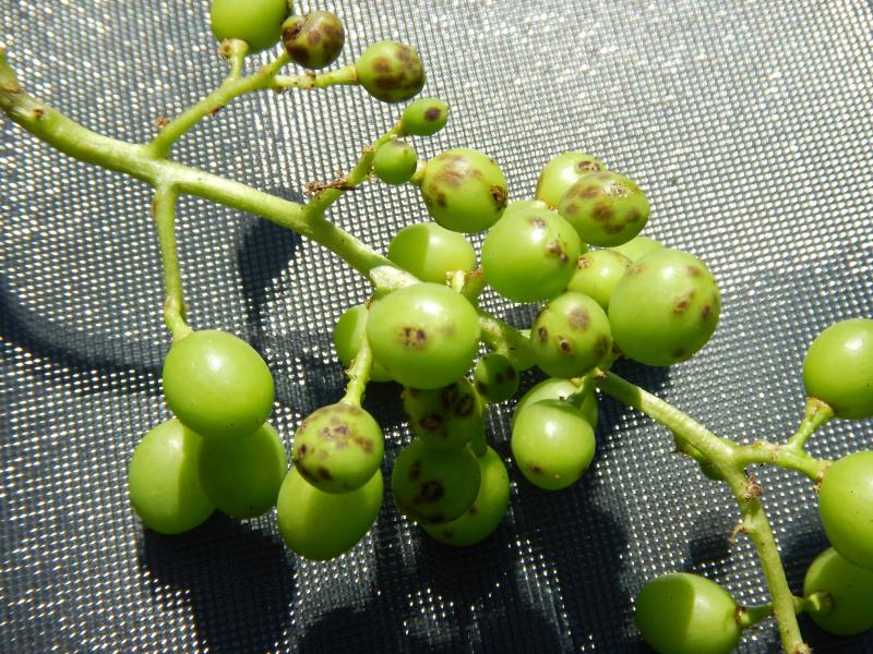 Bei vor 2 jahren gepflanzter Rebe ohne Giessen erste Sonnenbrandschäden an 3mm Beeren.