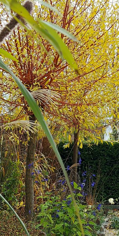 Die Salix alba ( vermutlich Britzensis, war eine Fehllieferung) leuchten dieses Jahr zum ersten Mal so schön, halten auch das Laub trotz Dauerwind überraschend lange.