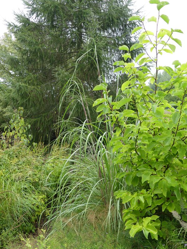 Eine imposante Erscheinung ist im Moment Saccharum ravennae. Ich meine, Danilo hatte es mir seinerzeit empfohlen. Es gab Skepsis, ob es hier winterhart wäre. Nun steht es schon ein paar Jahre. Dieses Jahr gibt es zumindest so etwas wie eine Chance auf die Blüte, so warm wie es war. Bisher hat das noch nie geklappt, weil die Sommer zu kurz waren. Mal sehen, wer schneller ist - der Frost oder das Gras.