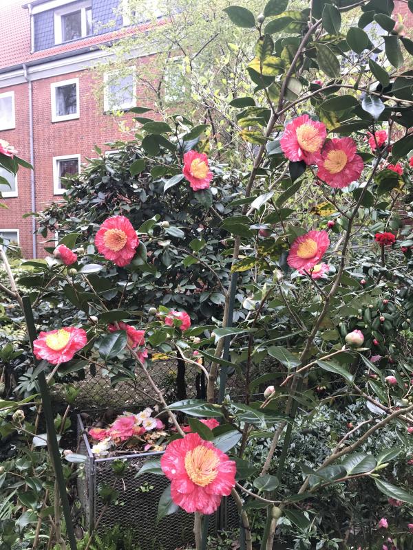 Hier ist noch Kamelienzeit... 'Leonard Messel' biegt sich über die Treppe in den Garten... die Farbe ist zwar etwas Bollywood-Style und die Blüten sind riesig aber ich mag es im Frühjahr. :D