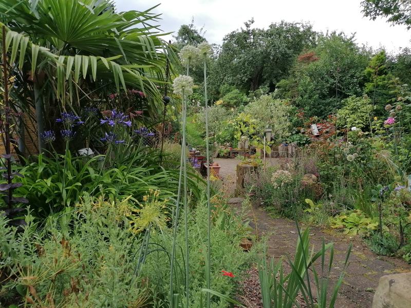 gAgapanthus öffnet erste Blüten, Crinum x powelli versteckt sich unter der Palme und ganz vorne ist der erste Zündfunke von Zauschneria ( Glasnevin?) zu sehen