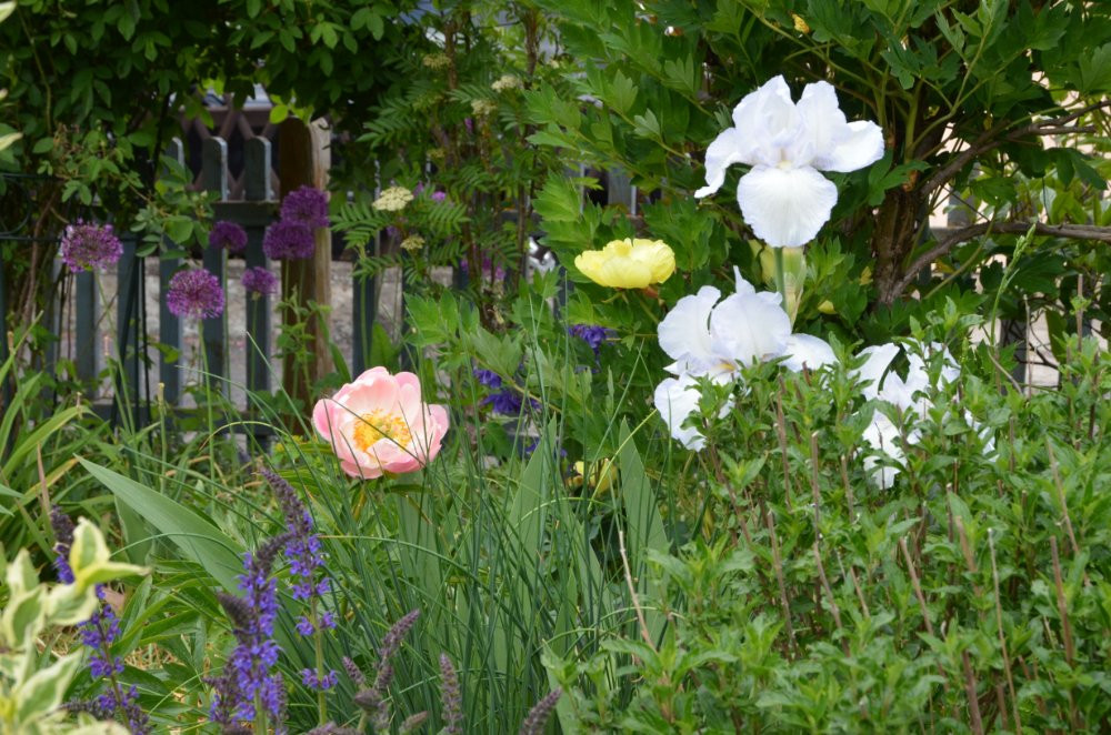 Diese dunkle Iris brachte mir zu viel Drama in den Garten, ich hab sie verschenkt. Daneben die Rose Frühlingsduft, die leider einen strengen Winter nicht überlebt hat.