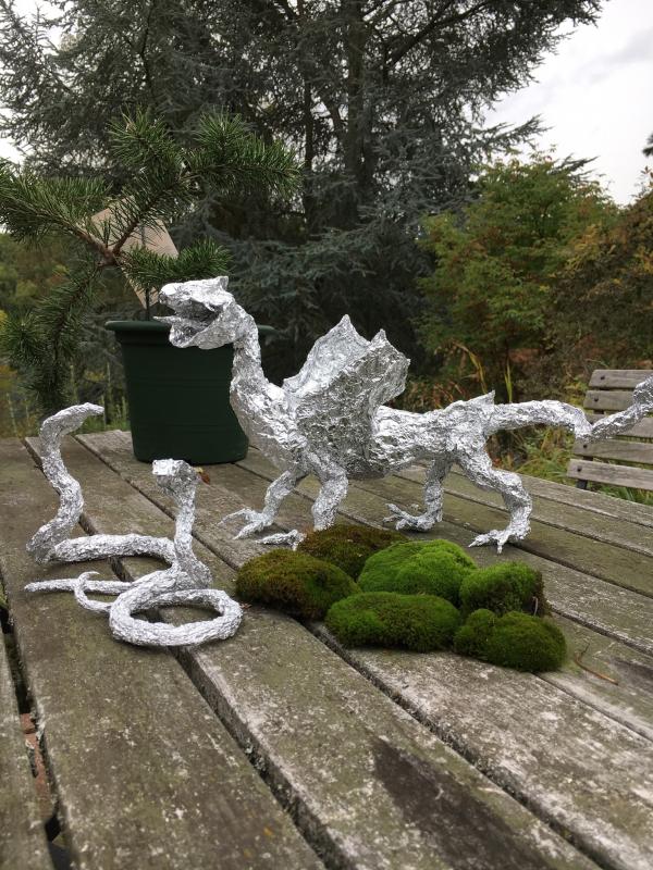 Da fällt mir ein, da könnte ich ja noch was zeigen. Unter Axels Einführung, Anleitung und Hilfe sind an einem Abend diese drei Alufolienfiguren entstanden.