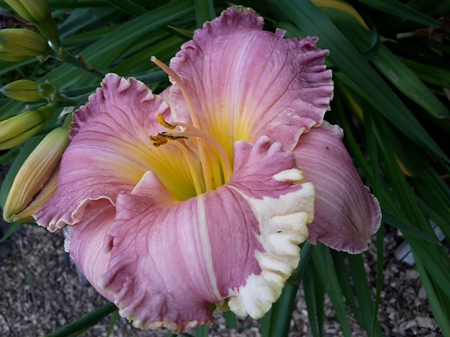 Pacifica x Marina del Rei. Blaues Auge auf bläulich-volett (später etwas roter, aber keine Spur von dem in der Taglilienwelt diskret umschriebenen Altrosa; öffnet gut, aber erstes Blühjahr, also nächstes Jahr vielleicht potthäßlich). Die Aufnahme ist nicht wie die meisten anderen Fotos ganz früh jemacht, sondern nach dem Jäten um 10 Uhr.