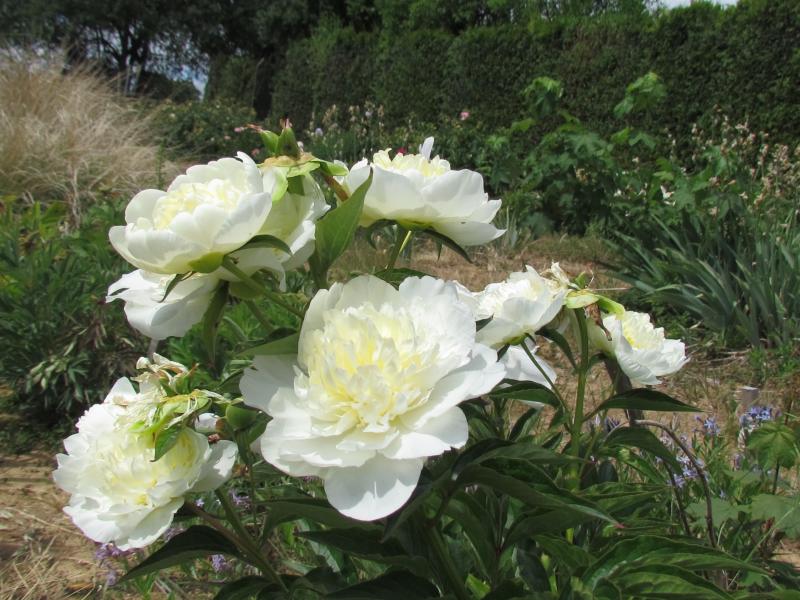 Relativ eindeutig `Festiva Maxima´, der Klassiker. Meterlanger Stiel, weswegen sie dann auch zur Blütezeit einen Umkreis von zwei Metern Durchmesser bedeckt, steht praktisch nie, oder man stützt. Dennoch zum Schnitt ganz große Klasse, wegen der vielen Nebenaugen werden Sträuße schnell voll.