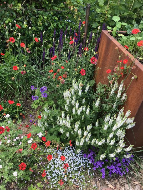 (Geum ‘Mrs. Bradshaw‘, Allium sphaerocephalon, Campanula portenschlagiana, Isotoma fluviatilis und verschiedene Nepeta- und Geraniumsorten)