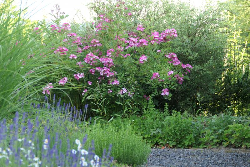 Der pinkparbene Blütenberg könnte 'Angela' (Kordes, 1984) sein.