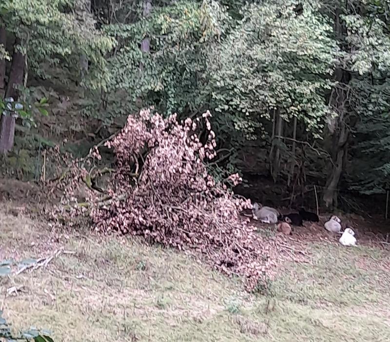 Heute war mit Zauberhand die Eiche von der Fläche geholt. Obwohl der Zaun noch stand. Die Böcke sind mittags umgezogen. Übrigens extrem vorbildlich. Thore hat das Ruder übernommen