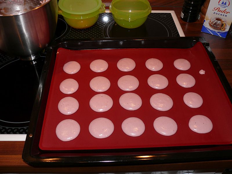 Das erste Blech mit den Erdbeermacarons. Und weil sie jedes mal anders werden,