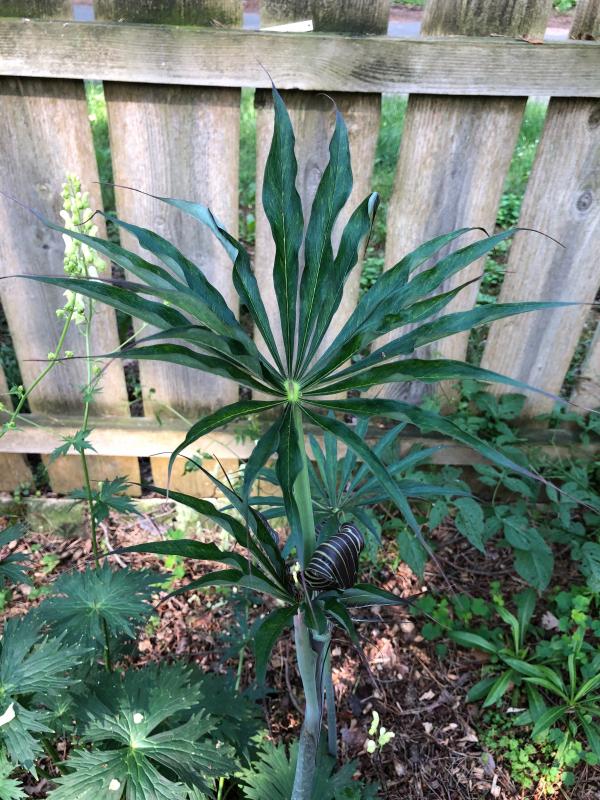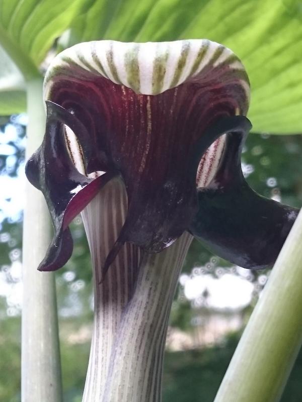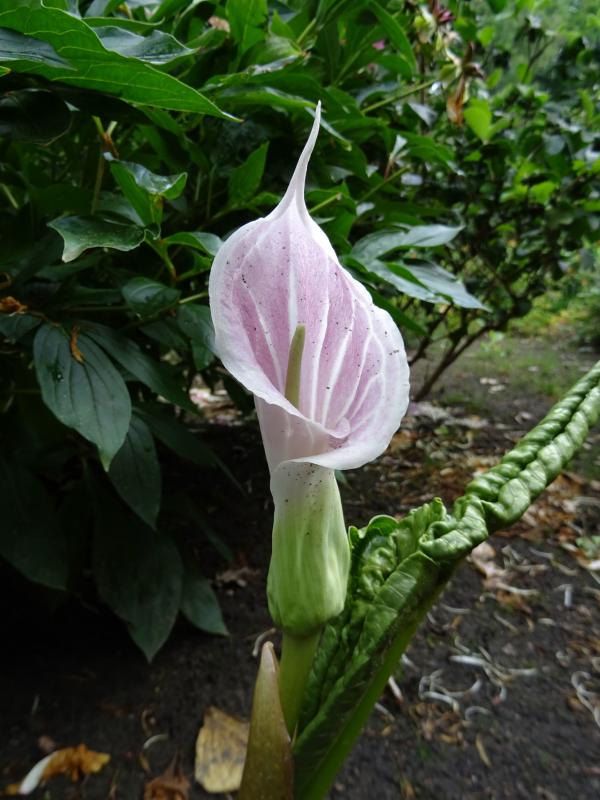 Hier blüht momentan Arisaema candidissimum, die Blüte leider etwas verschmutzt durch die Regen von vergangenen Tage