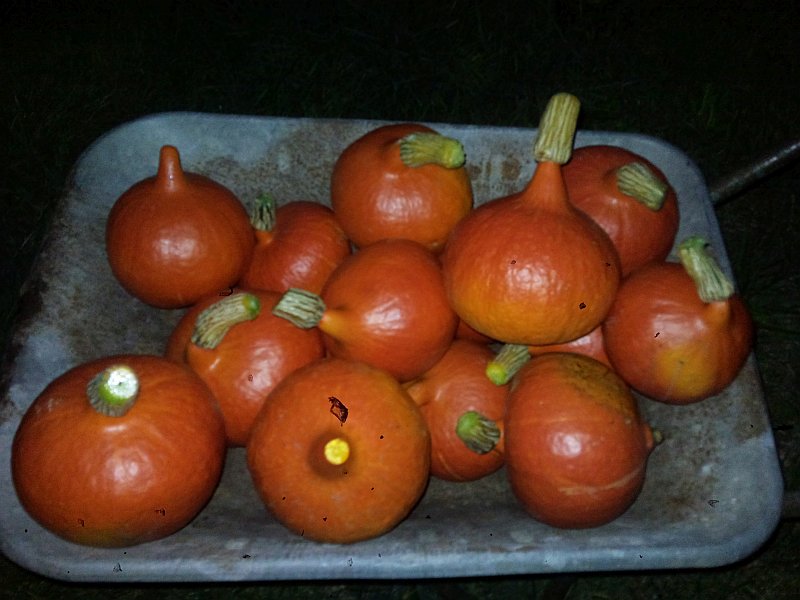 Jack be Little hat auch spät noch viele kleine Früchte produziert und 15 Stck. habe ich gestern geerntet. Unter einer Kürbispflanze saß ne fette Ratte :P :P! Gruselig!! Angefressen haben die aber noch ncihts....die wollen ja auch nicht Nutella-Zwieback in zahlreichen Fallen die für sie bereit stehen :-\