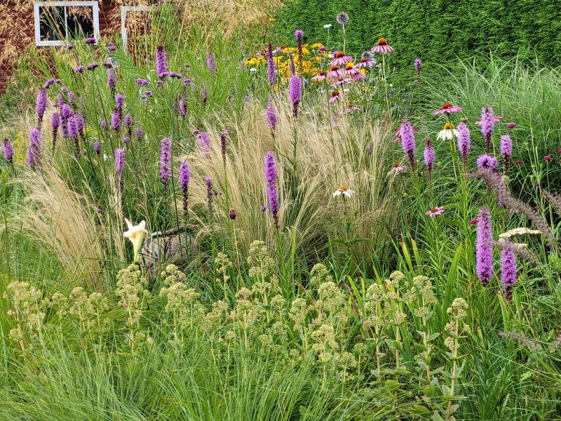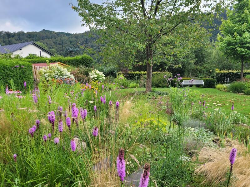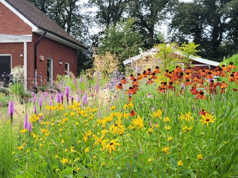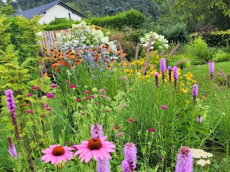 Selten habe ich im "Steppenbeet" Etwas auszusetzen, es sieht ( für mich) fast immer gut aus. So auch jetzt, wo Rudbeckia 'Goldsturm' neue Akzente setzt und Liatris in voller Blüte dagegen hält. Dazu wechselt Helenium 'Moerheim Beauty' von Dunkelrot nun auf Orange. Es kommt Farbe in das sonst eher ruhige Bild in diesem Beet. ;D