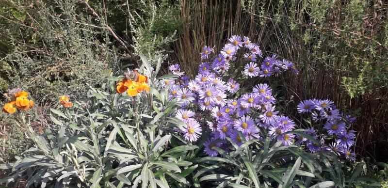 Aster `Barts Blue Beauty´, man kann sie gar nicht oft genug erwähnen. Blüht schon seit geraumer Zeit immer ein bisschen vor, jetzt voll. Wirkt manchmal ein wenig schmächtig, aber sie behauptet sich dann doch. Man müsste sie mal direkt mit den anderen Sommerastern vergleichen...