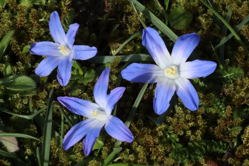 Scilla bifolia blüht in meinem Garten dieses Jahr bei weitem nicht so üppig wie in früheren Jahren, wahrscheinlich infolge der Trockenheit der letzten Sommer. Dafür haben Chionodoxa explosiv zugenommen, sie samen sich jetzt sogar in die Wiese aus. Wie kann ich junge, wenigblütige Sämlinge von Chionodoxa siehei von luciliae unterscheiden? Letztere hatte ich nur in andersfarbigen Auslesen gepflanzt, jetzt tauchen aber massenhaft blaue Sämlinge mit 2 Blüten auf. Rechts auf dem Vergleichsbild ist eine Blüte der Pflanze, die ich als Chionodoxa forbesii´Blue Giant´bekam.