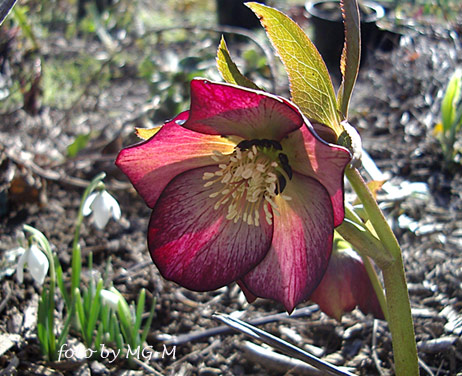 Ja, Sonne hatten wir heute, aber auch einen eisig kalten Wind. Trotzdem hat sich diese Helleborus davon nicht abhalten lassen, heute das erste Mal den Kopf zu heben, so daß ich in ihr hübsches Gesicht schauen konnte. Bisher haben die halbwegs geöffneten Blüten nur zaghaft nach unten geschaut.
