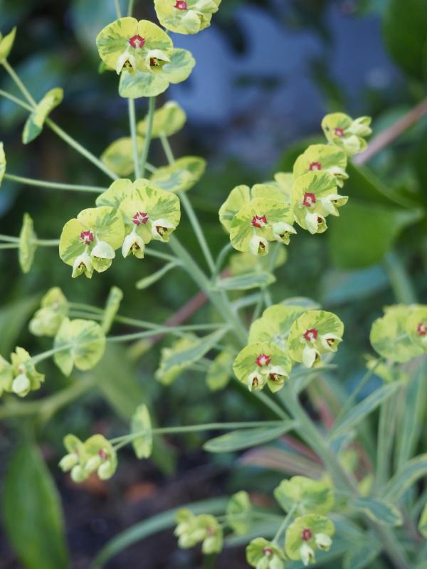 Eine neue Gartenbewohnerin. Euphorbia x martinii Ascot Rainbow. Genau genommen sind es drei kleine noch recht zarte Pflänzchen. Mich hat die Zartheit und der dezente aber schöne Farbverlauf beeindruckt.