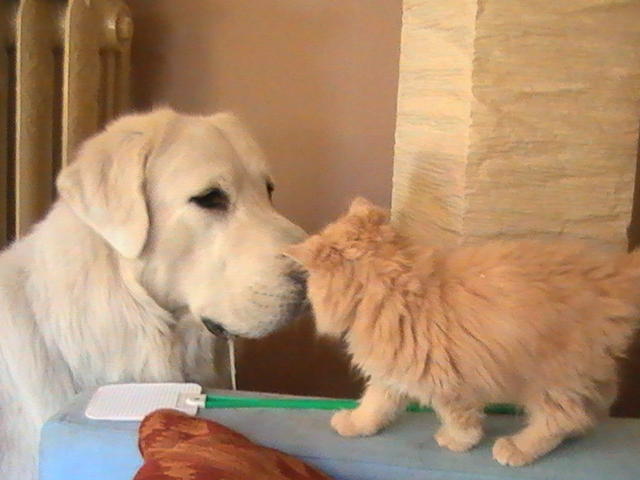 Erstkontakt mit dem Riesenhund, der gleich voll verliebt war. Peach dann eher weniger, vor allem weil sie danach patschnass geschlabbert war ;D