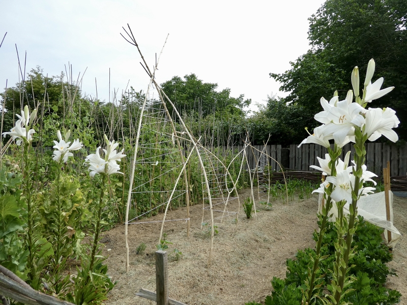 Während ich heut schubkarrenweise gedörrten Nichtmehrgrün-Kram gehäckselt habe, lassen sich die Madonnenlilien weder von Gluthitze noch von Trockenheit beeindrucken. Und skurrile Kletterhilfen basteln geht bei jedem Wetter.