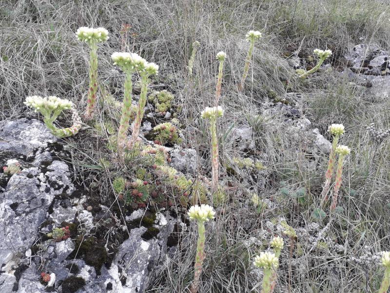 Am Straßenrand, zwischen Lauter- und Ermstal, dann aus dem Augenwinkel was gesehen, denn Fahrer zum Anhalten genötigt und tatsächlich, Jovibarba sobolifera/globifera. Sicher nicht die aller besonderste Pflanze, aber zumindest ich habe sie noch nicht so häufig gefunden. Dabei und auf der Wiese neben dem Fels noch Euphorbia cyparissias. Dort so wachsend wie man es gerne hätte, sich durchwuchernd wandernd, aber nicht alles erdrückend.