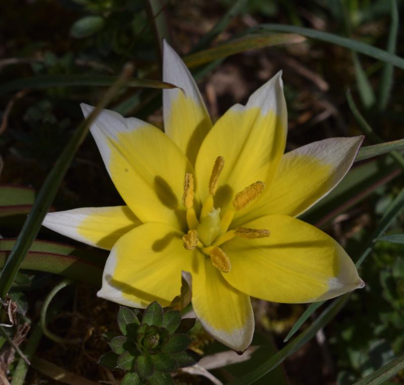 Gestern in der Apfelwiese hat sich die erste Tulipa tarda (? Bestandteil einer "WildtulpenMischung, gepflanzt vor zwei Jahren) geöffnet: