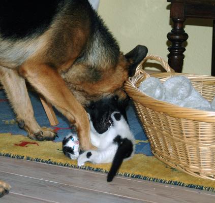 Das ging eine ganze Weile so, ein ausgiebiges Spiel, nach der die kleine Katze auf der einen Seite sich sehnte... und die Hündin auf der anderen.Natürlich mußte ich das immer bremsen, schließlich war es ein Katzenbaby, das auch Schlaf brauchte. Aber es war auch schön - das Baby hatte eine Beschäftigung und hing demzufolge nicht in meinen Gardinen...