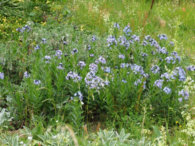 Amsonia 'Blue Ice' ist die niedrig wachsende Auslese davon. Auch lila zu Anfang der Blüte und dann groß und blau.