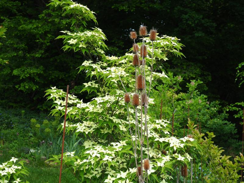 und es gab Cornus kousa var. chinensis 'China Girl' mit dem Skelett von Dipsacus laciniatus.