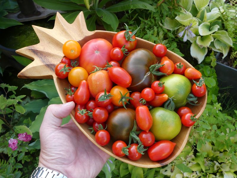 Die Resistenten machen dieses Jahr mehr Freude denn je. Nicht nur, weil sie ungerührt ohne Braunfäule wachsen, während empfindlichere Sorten bereits den Abgang machen und wild aufgegangene Pflanzen allesamt schon am Stengel braun sind. Heute einige "Rose Crush" geerntet - super Aroma, etwas Süsse, sehr schöne Säure und sehr kräftiges Aroma. Schmeckt "voll", Umami im Mund. Die Pflanze pumperlgsund.