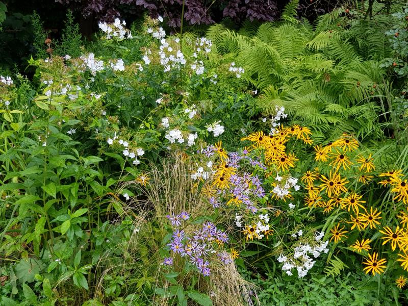 Auch eine bunte Mischung: ua Rosen, Rispenhortensie,Herbstanemone ,Rudbeckia
