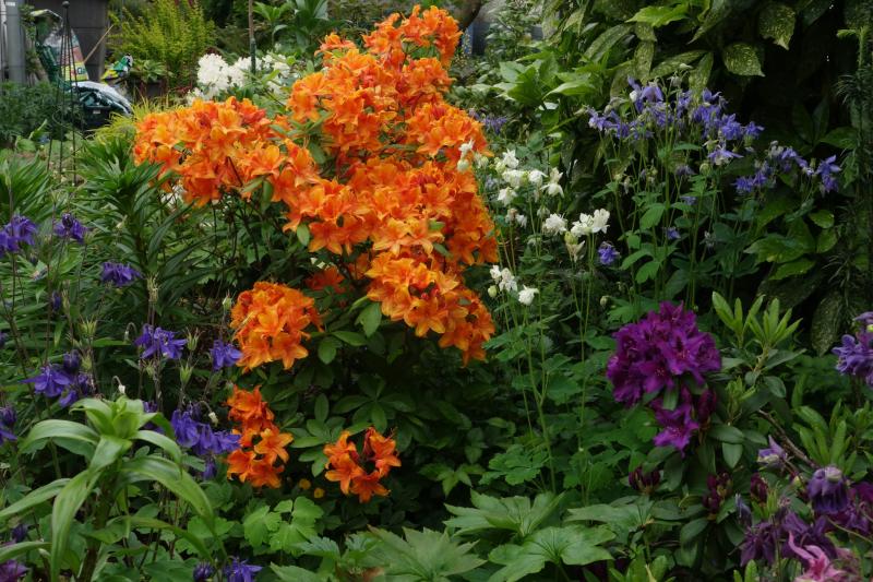 Akelei, mit Azaleen und Rhododendron, Aukuba, Lilien