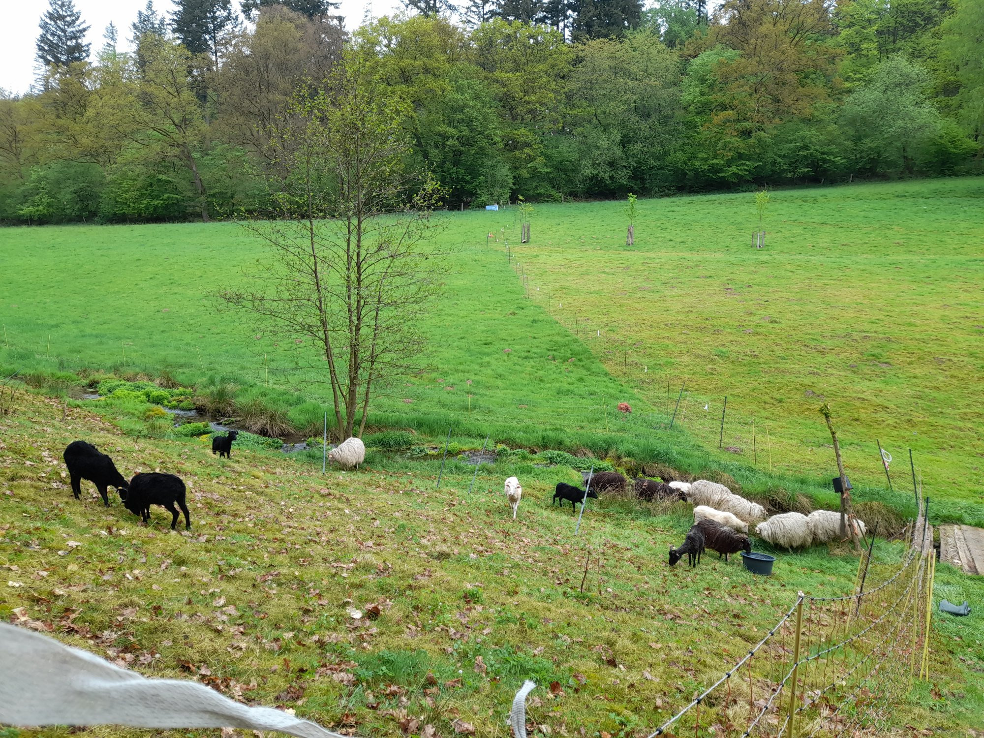 Für uns steht heute der Umzug der Böcke an. Weil wir noch zu wenig Flächenaufwuchs haben (wir sind ja im spätenFrühjahr hart über unsere Flächen gezogen), ziehen sie für einenTag innerorts. Die Nachbarn sind informiert, weil das laut und äh... naja gewaltig werden kann. Die Fläche ist nicht sehr groß. Ich muss die engmaschig kontrollieren. Danach fahren sie auf eine Brennnesselfläche am Riepenbach (keine Förderfläche), bevor sie auf die Zielfläche ziehen.