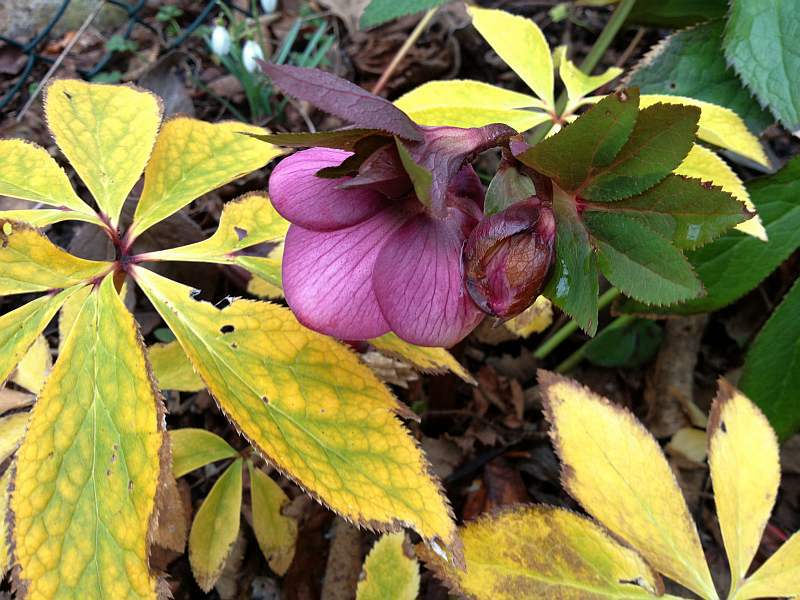 Ich habe eine Pflanze mit weißen Blüten mit ziemlich vielen Blütenstielen und glockenförmig hängenden Blüten, sie blüht besonders früh und dann ist es wirklich angebracht, dass sie ihre Blüten schützt. Außerdem steht sie im Schneeglöckchen- und Märzenbecherrevier, sodass sie deren Habitus in größer wiederholt. Es stimmt, manchmal ist auch eine hängende Blüte schön.Inzwischen hab ich mich damit abgefunden und finde auch durchaus schöne Rückseiten erstrebenswert.