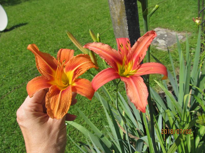 Farbvergleich H. fulva und H. fulva rosea - letztere hat größere Blüten und schmalere Blütenblätter, sie wird hier höher und blüht auch später: