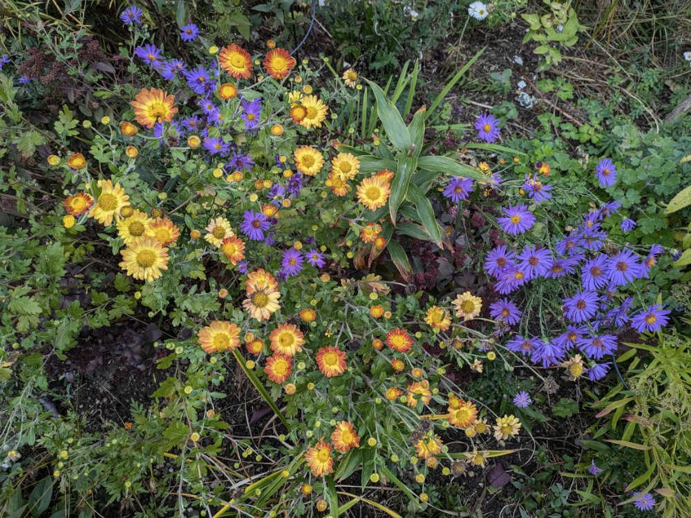 Aster 'Orpheus' neigt sich zu Chrysanthemum 'Dernier Soleil' herab.