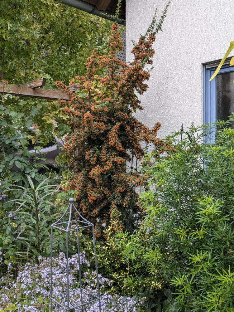 Sorbus aucuparia 'Autumn spire' hat zumindest ein paar Früchtchen, mal sehen, ob das noch wird mit der Herbstfärbung. Im Hintergrund haben sich zu den weißen Puscheln auch rötliche eingefunden, das hat sich doch scheinbar was selbst gesetzt...Da werde ich wohl mal ranmüssen.