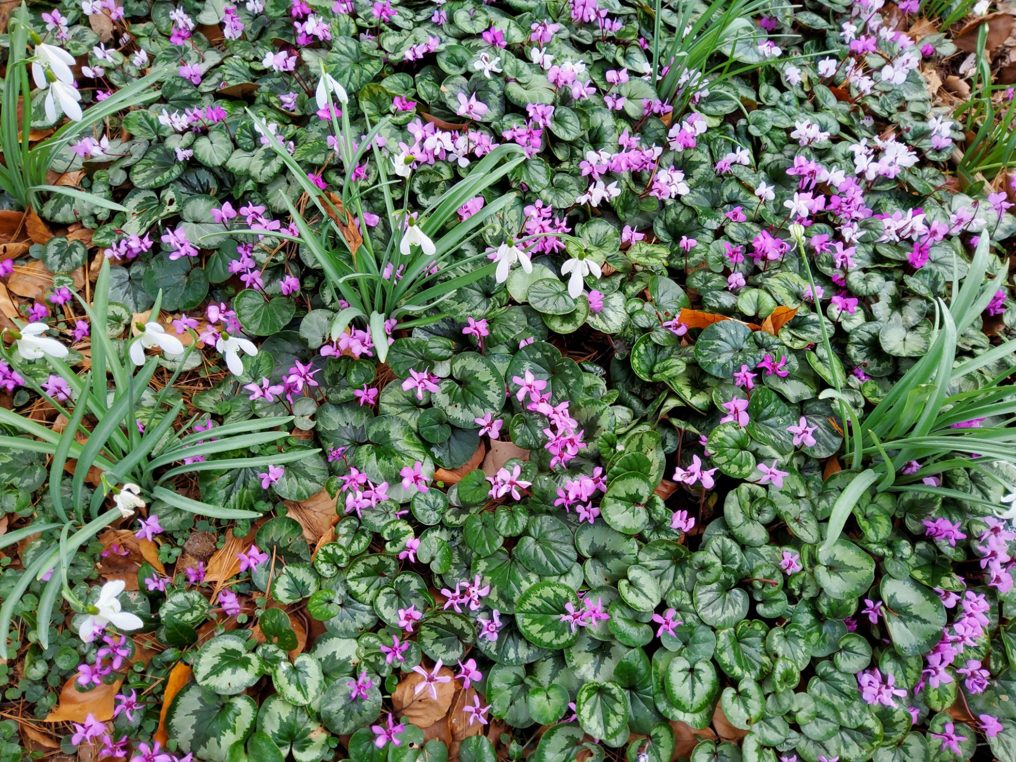 Unter dem Cyclamenteppich ist flächendeckend Vinca minor, und natürlich viele Cyclamenbabies. Letztere kann man auch nur in den Randbereichen sehen ... ich pikiere die schon lange nicht mehr.