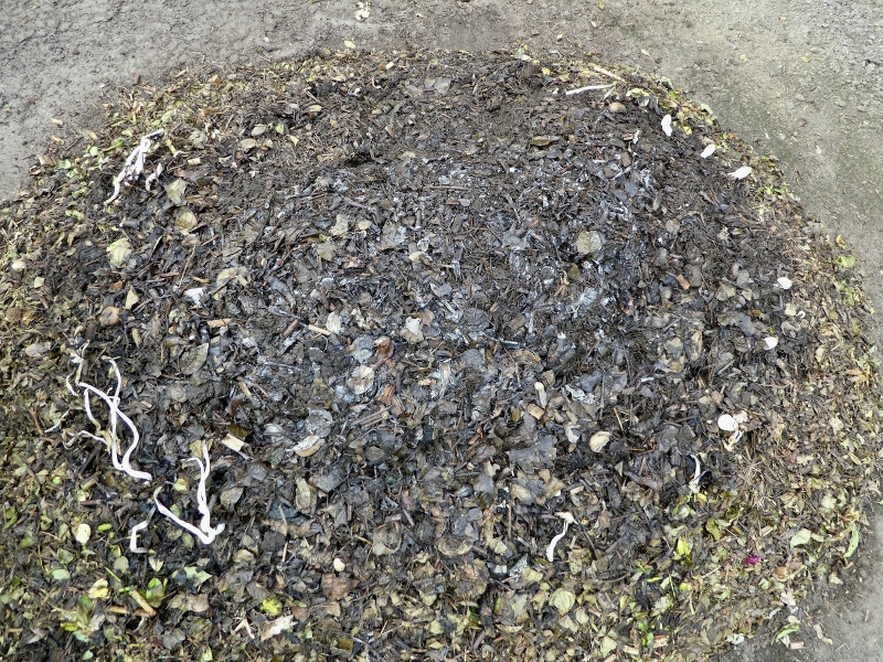 Zuletzt hatte ich ihn am Dienstag letzter Woche aufgesetzt, es war viel auf einmal, ich hatte noch ein bisschen Wasser dazugegeben. Am ersten Abend kam er auf 60 °C, dann war er drei Tage lang auf 70 °C Kerntemperatur. Und ich hatte zuviel um die Ohren, frisch Gehäckseltes kam ohne Umweg über den Kompost direkt auf die Baumscheiben, für Kompostumsetzerei war grad keine Zeit.