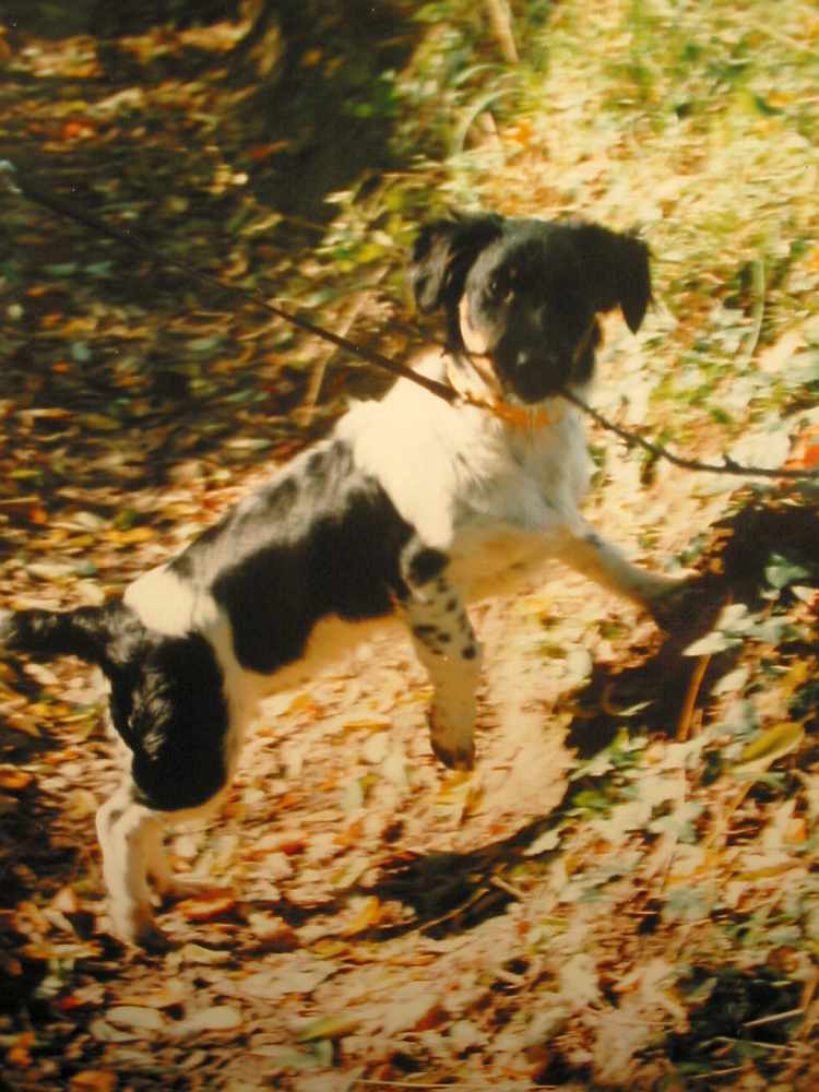 8)Wir haben auch gefeiert, am letzten Sonntag, dem 4.November, da waren es genau 17 Jahre her, dass wir unseren Dickie im Tierheim gefunden und gleich mitgenommen haben.Fast hätte er uns den Termin vermasselt, seit Mitte Oktober wollter er eigentlich sterben (Durchfall, Ohnmachten, Epileptische Anfälle, Verwirrtheit, Tierklinik mitten um zwei in der Nacht, Valium etc., Tränen, Schwäche, Elend, huahhh, was erwartet man bei einem fast 18-jährigen Hund...)drei Wochen ging das so, jeden Tag dachte ich, das wars jetzt, jeden Morgen hab ich gehorcht, ob er sich regt oder geguckt, ob er atmet, aber immer wieder rafft der olle Zausel sich auf, nach einem Besuch mitsamt Wägelchen bei der netten Tierärztin ein Dorf weiter, wo wir ihn hingeschoben haben, geht es ihm mittlerweile wirklich viel besser (er bekommt jetzt fast die gleichen Herzpillen, wie ich und Schilddrüsenhormone, die im Blutbild fehlten) er ist zwar etwas wackelig unterwegs, aber mittlerweile alleine im Garten bis ganz nach hinten in die Wildnis, ich brauch ihn bei seinen Geschäftchen nicht mehr stützen, er kippt dabei nicht mehr um, heute morgen hab ich ihn im Schlafanzug gesucht, der Bursche hat Mäuse gejagt und sich nicht gemeldet, erst seine klimpernden Hundemarken haben ihn verraten...jetzt schnarcht er vorm Kamin, ich hoff, er bleibt noch ein wenig...Das isser mit etwa einem halben Jahr am Tag, nachdem er zu uns kam: